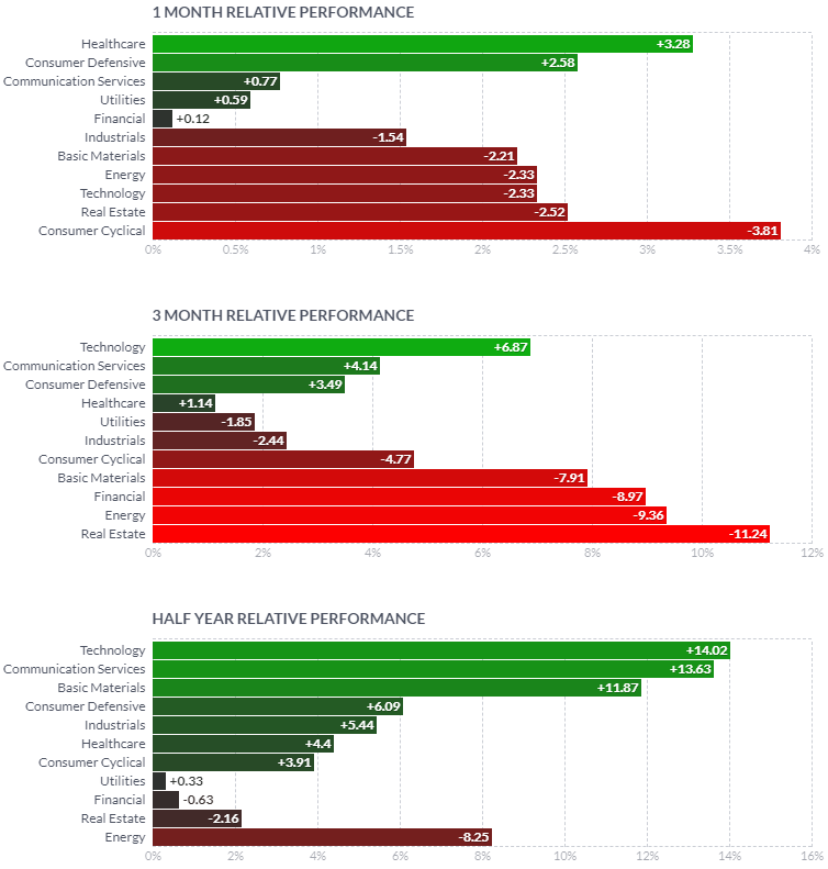 1일/한 달/3달/반년 섹터별 등락률을 통해서, 시장 상황을 가늠해 볼 수 있습니다.