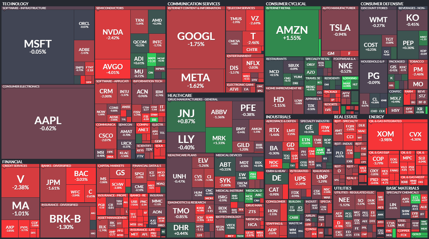 미국 S&P500에 속한 기업들의 주가 등락을 살펴봅니다. 같은 섹터 내에서도 개별 기업 이슈로 인해 주가가 서로 다르게 움직이는 것을 볼 수 있습니다. 특히 섹터 내 대장주, 주도주의 움직임을 통해 해당 섹터의 성장성을 가늠해 보기 좋습니다.