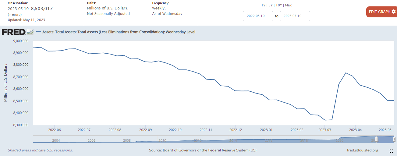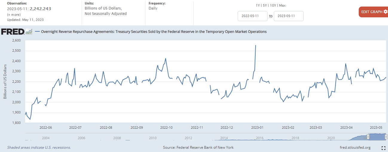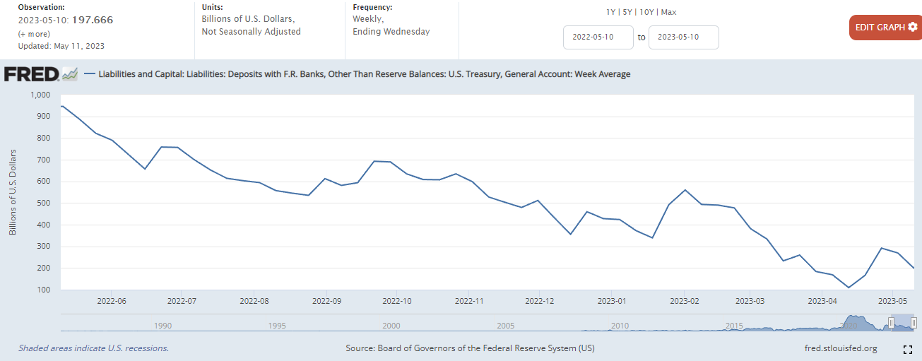 현재 미국 정부의 TGA계좌는 급격히 감소하고 있습니다. 4월18일 미국 정부에서 확보한 세수로 잠시 반등했지만, 급격히 다시 하락하고 있는 상황이죠. 게다가 부채한도 협상도 난항을 겪고있습니다.