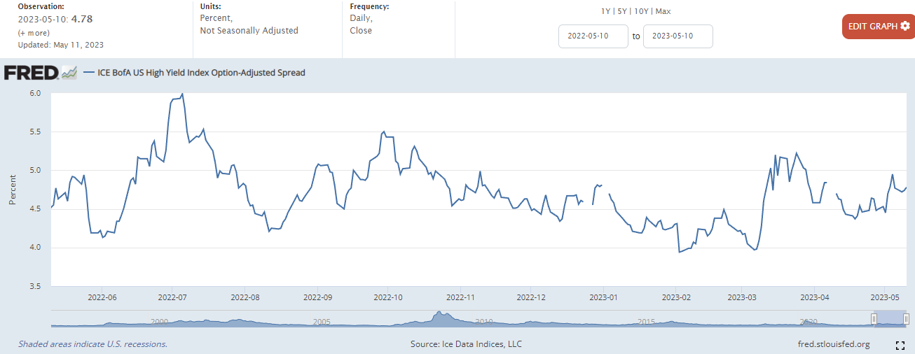 하이일드 채권 스프레드 : 하이일드 채권 수익률에서 국채 수익률을 뺀 값으로, 이 값이 상승하면 시장이 위험하다는 신호로 볼 수 있습니다. 4% 이하로 하락해야 시장이 안정적인 것으로 판단합니다.