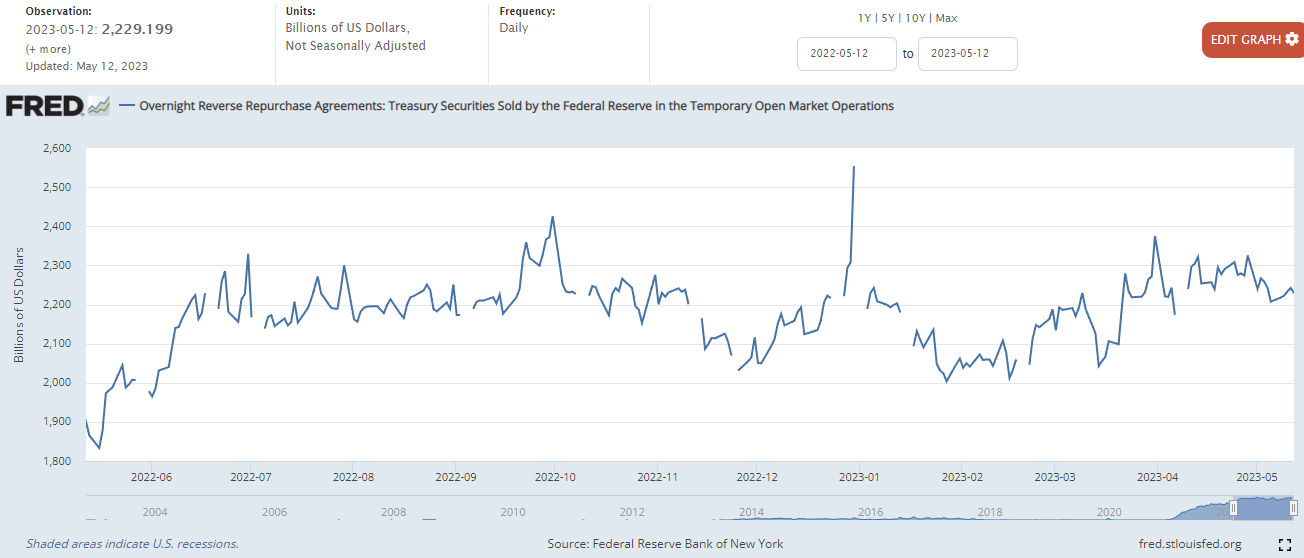 Treasury General Account(TGA) : 미국 재무부에서 세금이나 국채를 발행함으로써 확보한 자금을 보관하는 계좌에서 자금의 변동을 차트로 표시합니다. 국채를 많이 발행하여 팔게 되면 차트가 상승하고, 재정지출이 발생하면 차트가 하락합니다. 이러한 미 재무부의 계좌는 의회에서 정한 부채한도가 정해져 있기 때문에 국채를 마구 발행할 수 있는 것은 아닙니다. 23년 4월 3일 현재 미국의 부채한도가 상한선에 도달하였으므로, 양적완화를 하는 경우가 아니라면 차트의 상승은 유동성의 흡수로 인한 것으로 볼 수 있습니다.