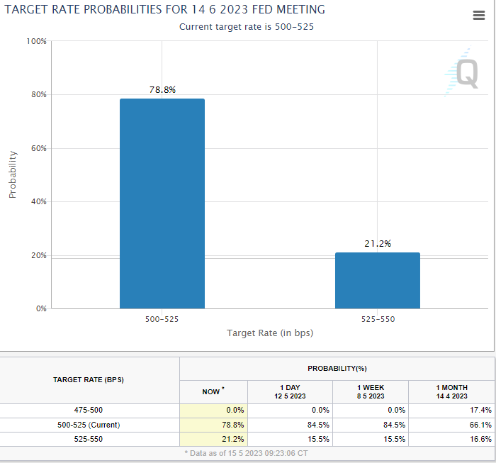 페드워치에서 6월 14일 FOMC에서 미국이 기준 금리를 25bp 인상할 것이라는 확률이 점점 높아지고 있습니다. 이러한 기준 금리 인상 확률이 높아지는 이유는 5월 발표된 인플레이션과 노동 시장 지표들이 예상치보다 높게 나왔기 때문으로 볼 수 있겠습니다.