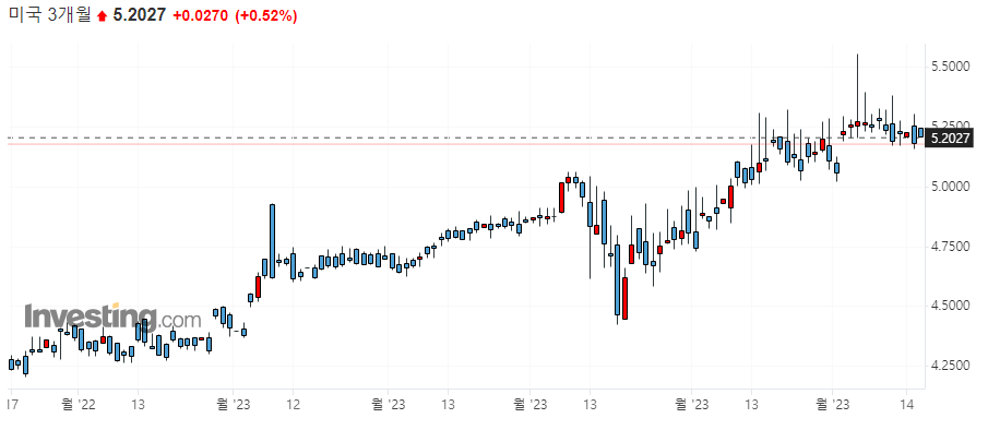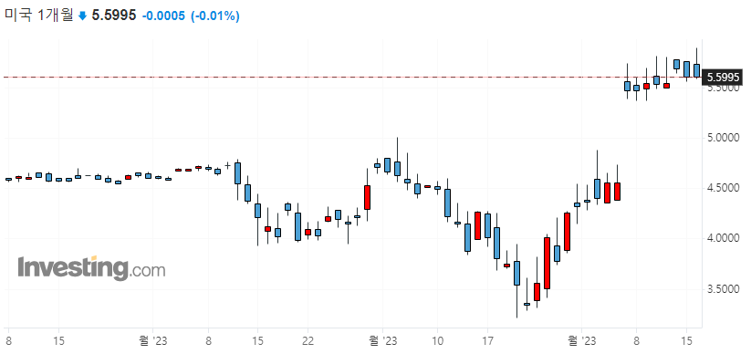 미국 1개월 물 국채 수익률이 지속적으로 상승하는 모습이 나타나고 있습니다. 이러한 추세적 상승은 미국에서 6월 1일 디폴트가 일어날 수 있다는 채권 트레이너들에 불안을 반영한다고 볼 수 있는데요. 16일 오늘 케빈 매카시 하원의장과 바이든 대통령이 부채한도 협상을 위한 회의를 가질 예정이므로, 이 협상 결과에 따라 1개월 물 국채 수익률이 급락하는 모습이 나타날 수 도 있습니다.