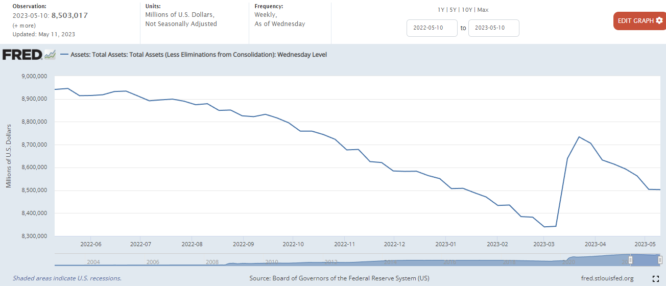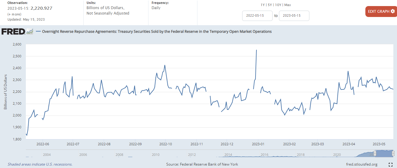 Treasury General Account(TGA) : 미국 재무부에서 세금이나 국채를 발행함으로써 확보한 자금을 보관하는 계좌에서 자금의 변동을 차트로 표시합니다. 국채를 많이 발행하여 팔게 되면 차트가 상승하고, 재정지출이 발생하면 차트가 하락합니다. 이러한 미 재무부의 계좌는 의회에서 정한 부채한도가 정해져 있기 때문에 국채를 마구 발행할 수 있는 것은 아닙니다. 23년 4월 3일 현재 미국의 부채한도가 상한선에 도달하였으므로, 양적완화를 하는 경우가 아니라면 차트의 상승은 유동성의 흡수로 인한 것으로 볼 수 있습니다.