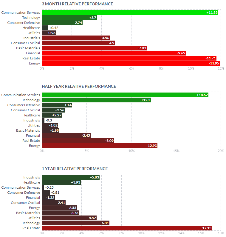 최근 기술주의 강세가 무섭습니다. 섹터별 6개월간에 퍼포먼스를 보면, 기술주가 얼마나 강세를 보이고 있는지 알 수 있는데요. 반대로 에너지 섹터의 주가는 하락하고 있는 모습입니다.