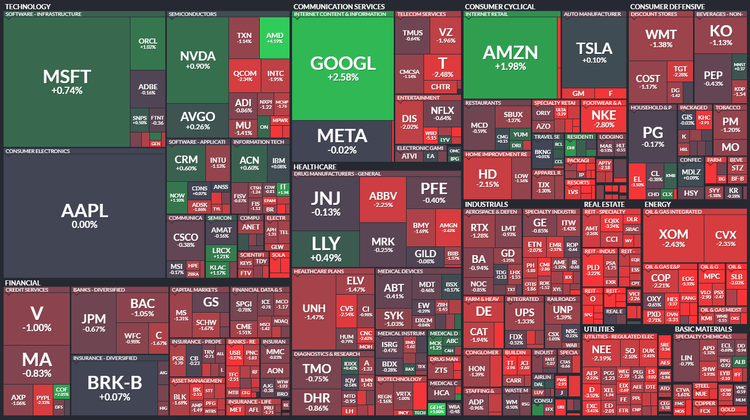 미국 S&P500에 속한 기업들의 주가 등락을 살펴봅니다. 같은 섹터 내에서도 개별 기업 이슈로 인해 주가가 서로 다르게 움직이는 것을 볼 수 있습니다. 특히 섹터 내 대장주, 주도주의 움직임을 통해 해당 섹터의 성장성을 가늠해 보기 좋습니다.