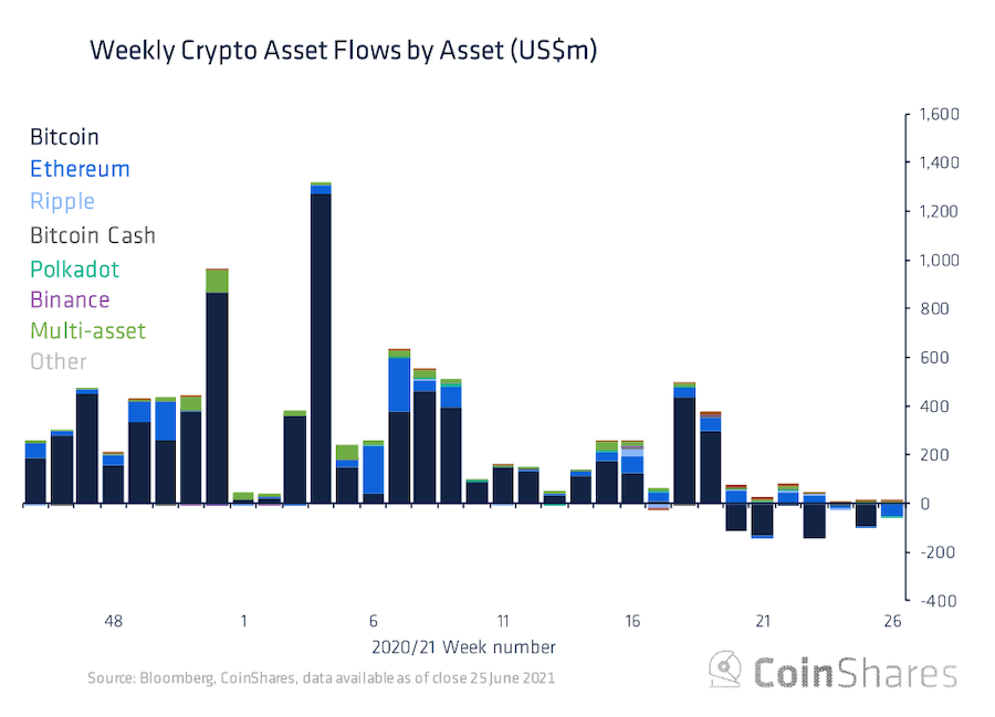 가상 통화 관련의 금융상품 전반에서는, 4주 연속으로 자금 유출을 관측.누적 4,400만달러에 이르렀다.