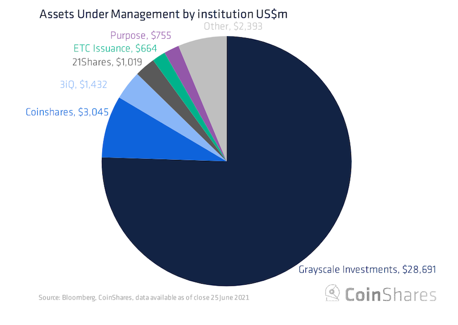 기업별로 보면, 미 암호화폐 투자 대기업 그레이스케일사의 자산운용 잔액이 월등하다.최근에는 3월부터 인기상품인 비트코인투자신탁(GBTC)으로의 신규 유입이 정지됐지만 여전히 75%를 차지하고 있다.