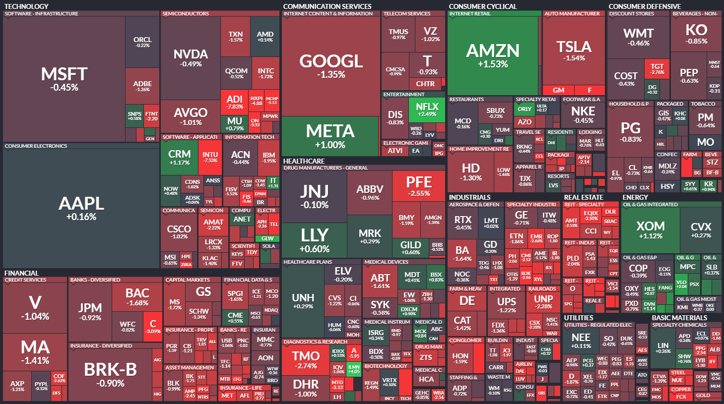 미국 S&P500에 속한 기업들의 주가 등락을 살펴봅니다. 같은 섹터 내에서도 개별 기업 이슈로 인해 주가가 서로 다르게 움직이는 것을 볼 수 있습니다. 특히 섹터 내 대장주, 주도주의 움직임을 통해 해당 섹터의 성장성을 가늠해 보기 좋습니다.