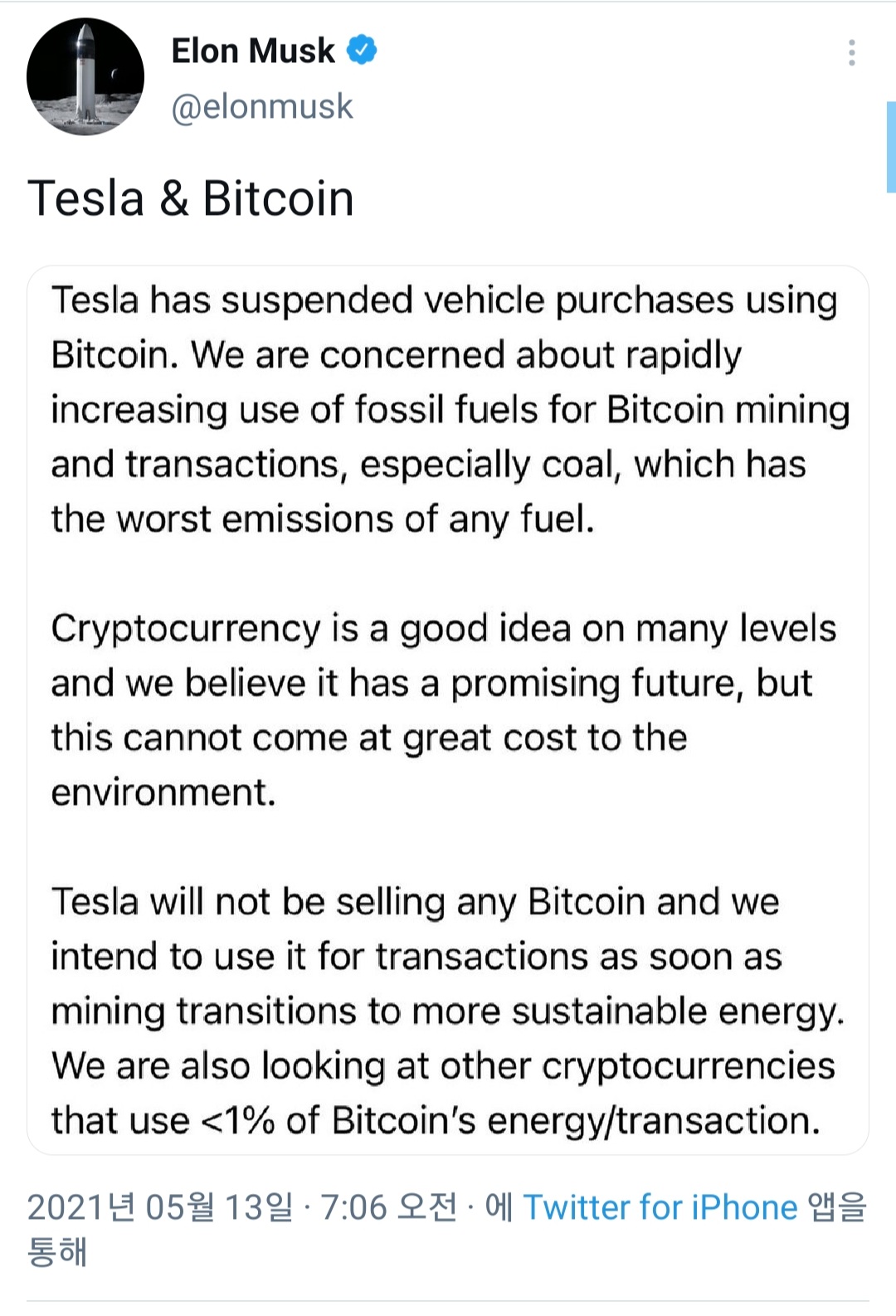 테슬라는 비트코인을 팔지않을 것 입니다. 그리고 우리는 채굴(비트코인을 만드는 것을 채굴이라고 합니다.)하는데 사용되는 에너지가 좀 더 지속 가능한 에너지로 대체된다면, 그때 비트코인을 거래에 사용할 것 입니다. 테슬라는 비트코인보다 에너지 사용이 적은 또 다른 암호화폐를 찾고있다.