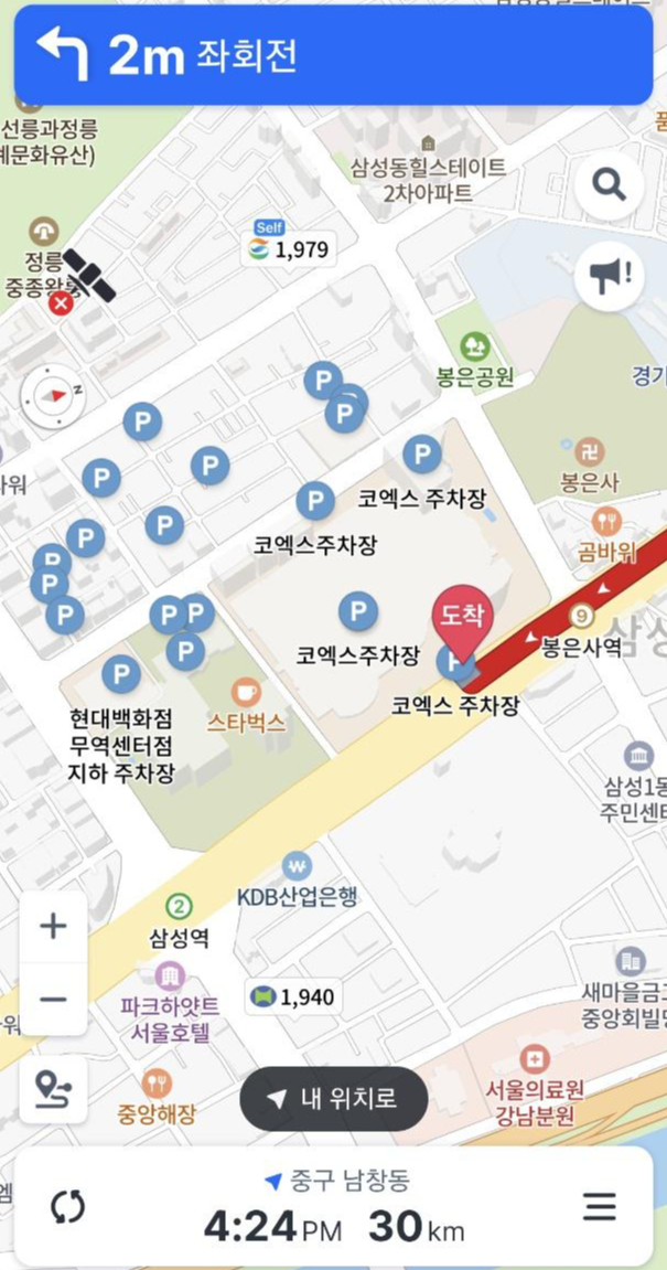 이 부분이 네이버 내비게이션에 가장 큰 특징이다. 지도 기능과 연계되어 있기 때문에, 운전해서 목적지에 도착한 경우, 주변 주차장을 추가해줍니다. 또한 자동차 -> 도보로 바로 연계되어 도보로 계속 길 안내를 받을 수 있도록 되어있는데 이 부분은 네이버 지도, 내비게이션만에 장점입니다.