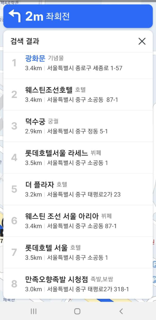 아래 사진에서 우측 상단에 마이크 모양을 터치한 후, 목적지를 이야기하면, 목적지에 대한 주소 정보를 검색하여 보여줍니다. 검색된 주소지가 번호순서로 나열되는데 이때 첫번째 주소지로 가고 싶다면, 예를 들어 광화문으로 가고 싶은 경우, "몇번째 장소로 안내할까요?"라는 물음에 "첫번째"라고 대답하면 됩니다.
