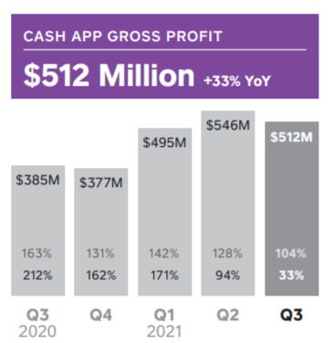 비트코인의 창구인 스퀘어사의 앱 Cash App 전체도 호조로, 수익이 23억9,000만달러에 대해, 5억1,200만달러의 이익을 내고 있다. 비트코인을 제외한 Cash App의 수익은 5억7,800만달러가 되었다.