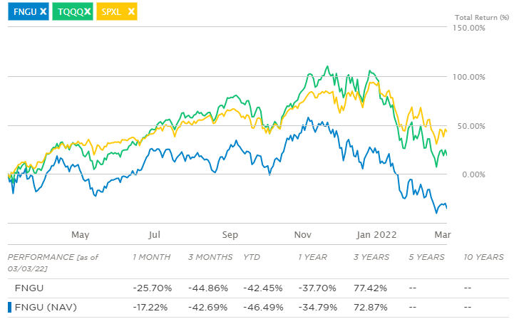 FNGU는 미국 상장 기술 및 소비자 재량 기업의 동일 가중 지수 일일 가격 움직임의 3 배를 추적합니다.