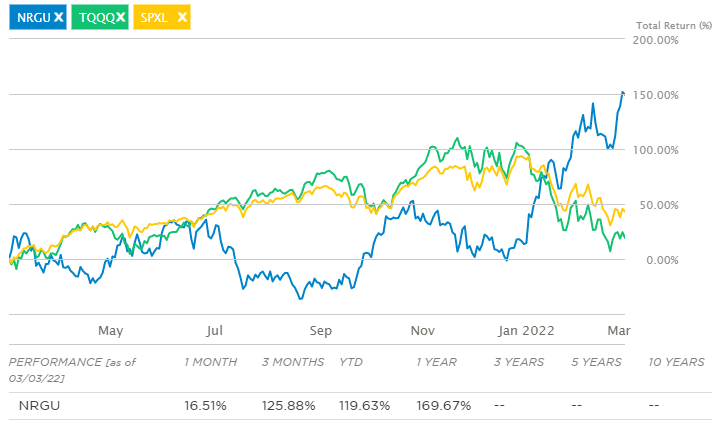 22년 1월 부터 우크라이나와 러시아의 전쟁 이슈로 인해 유가가 급등하면서, NRGU가 엄청난 수익률을 보여주고 있습니다. 하지만, 최근 미국 시황 분석에서도 말씀드렸던 것처럼, 현재 미 바이든 대통령이 연설에서 동맹국들과 함께 전략 비축유를 풀어 유가를 안정화시킬 예정이며, 대체에너지(태양광, 풍력, 원자력 등)를 통한 에너지 독립을 선언한 이상 투자에 주의하셔야할 것 같습니다.