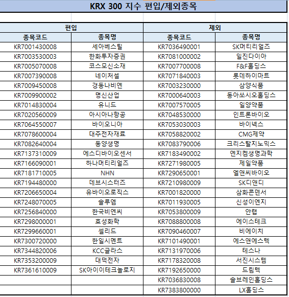 안녕하세요. 방구석 김사장입니다. ^^ 오늘 오전 삼프로TV에서 교보증권 박부장님께서 지나가듯이 언급하셨던, KOSPI 200, KOSDAQ 150, KRX 300 구성종목 편입/편출과 관련된 정보를 가져왔습니다. KOSPI 20