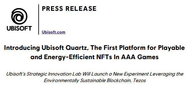 해외 암호화폐 전문 채널 코인 포스트에 따르면, 대기업 게임 기업 유비소프트(Ubisoft)는 7일, 트리플 에이(AAA)급의 게임으로 첫이 되는 NFT(비대체성 토큰) 플랫폼 「Ubisoft Quartz」를 오픈했다.
