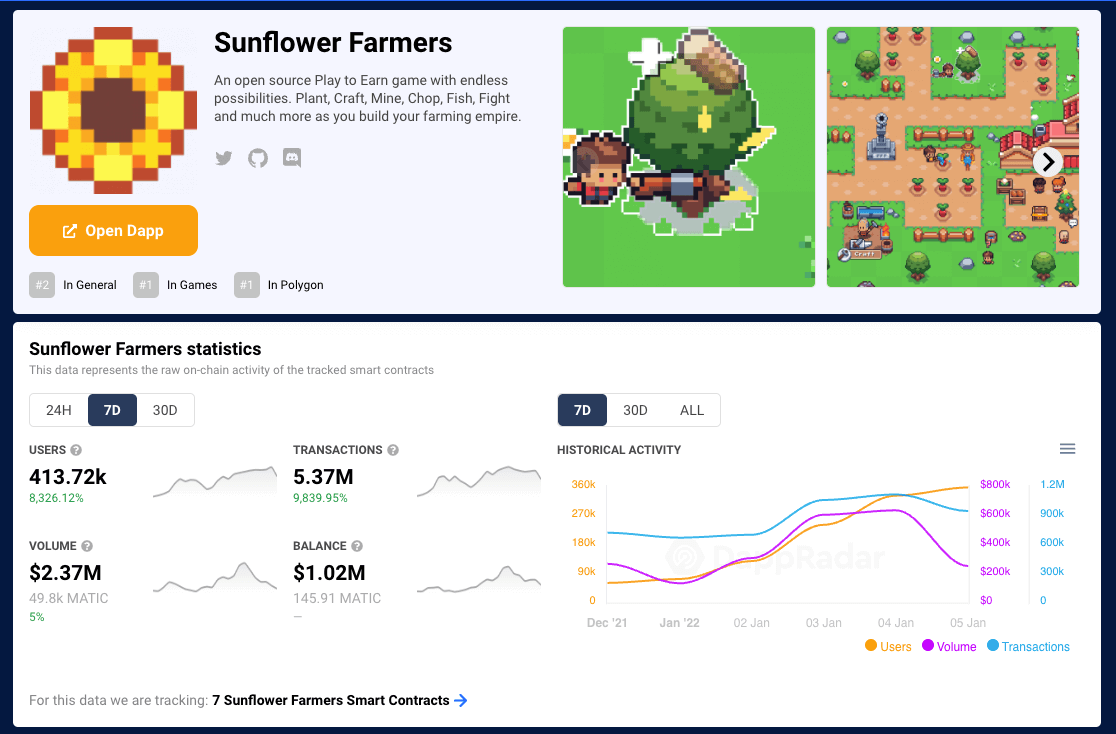 주된 요인은, NFT(비대체성 토큰)와 폴리곤 네트워크를 사용한 블록 체인 게임 「Sunflower Farmers(해바라기 농가)」의 인기화다. 일찍이 mixi에서 유행했던 브라우저 게임 「선샤인 목장」을 방불케 하는 농작물 수확 게임이다.
