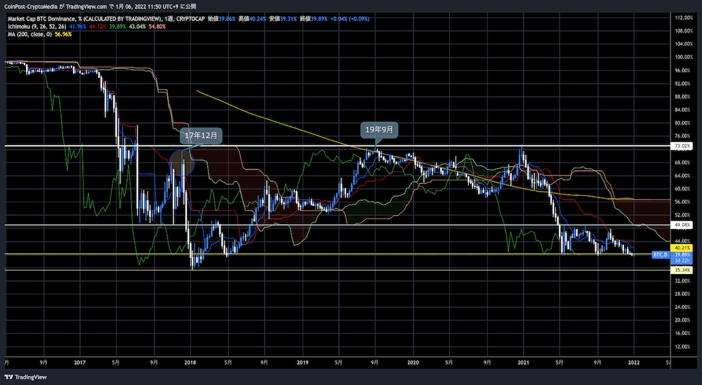 비트코인드미넌스의 감소는 2021년 이후 알트코인 버블 재래의 영향이 크지만, 21년 12월 이후에는 알트 코인 시장으로부터의 자금누락도 눈에 띄기 시작해 하락 트렌드를 뚜렷이 하고 있다.