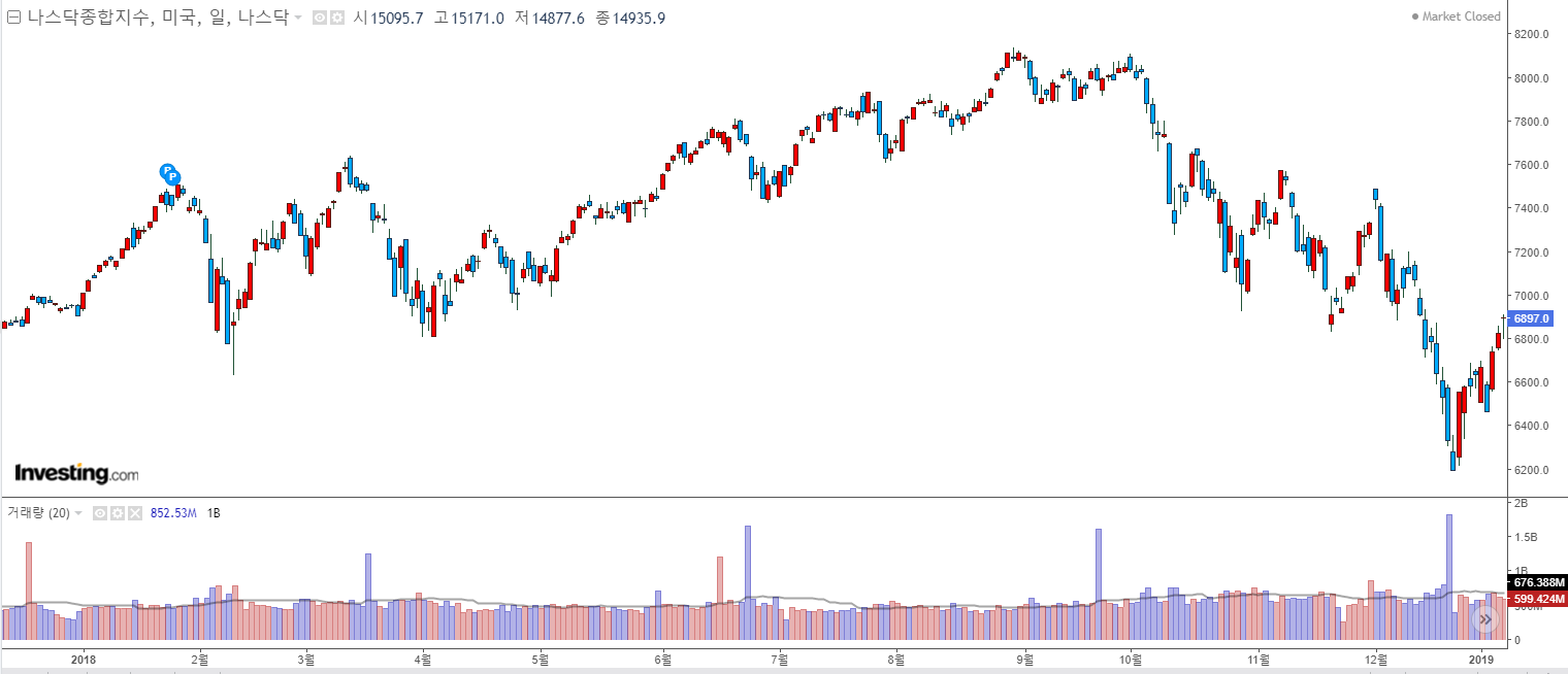 2018년은 연초에 지수가 급히 상승한 후, 연말에 가서야 해당 고점에서 8%를 조금 넘게 됩니다. 그 후, 24%가량 지수가 급락하게 됩니다.