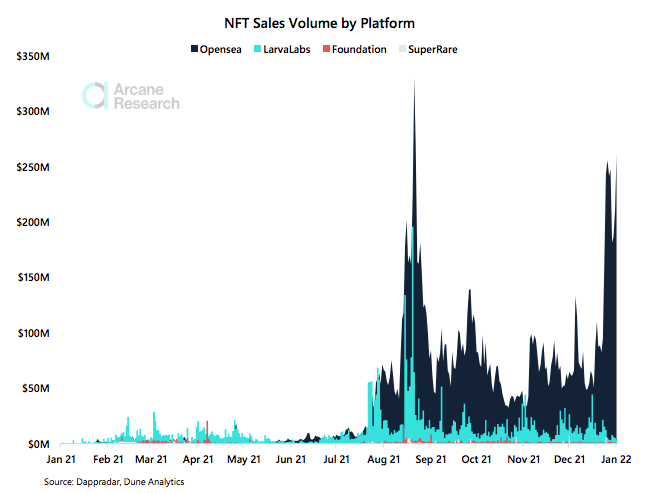 Arcane Research에 의한 최근 보고서에 따르면 NFT 마켓플레이스 최대 기업 Open Sea의 기세는 꺾이지 않고 있다.엄밀하게는, 작년 여름의 NFT 붐을 거쳐 일시적으로 진정되기 시작했지만, 연초에 걸쳐 다시 활성화하고 있다.(아래 그림)