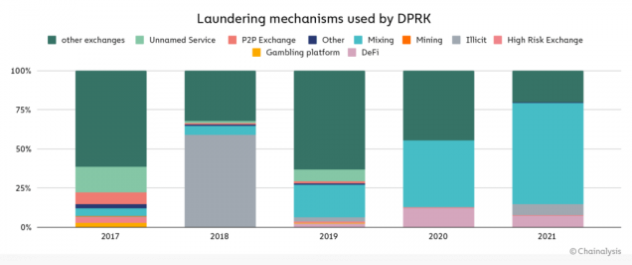 북한은, 훔친 가상 화폐를 DeFi(분산형 금융)나 믹서등을 사용해 자금 세탁하고 있는 모양이다. 믹서란 가상화폐의 출처나 소유자의 정보를 암호화하는 웹사이트 또는 소프트웨어를 말한다. 믹서기를 사용하는 이유는 훔친 가상화폐의 출처를 은폐해 법정화폐로 교환하기 위한 것으로 보인다. 북한이 2021년 훔친 가상화폐 중 65% 이상이 믹서를 통해 돈세탁됐다.