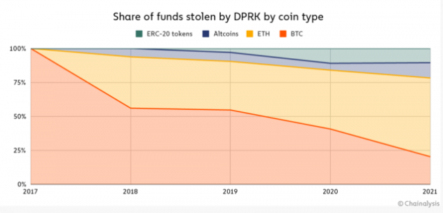 북한의 사이버 공격은 중국이 관리하는 해커집단 라자루스(Lazarus)가 주도하는 것으로 알려졌다.2021년 북한에 도난당한 가상화폐는 58%가 이더리움(ETH)이었다.ERC-20 토큰과 알트코인은 각각 22%로 비트코인(BTC)은 전체의 약 20%에 불과했다.
