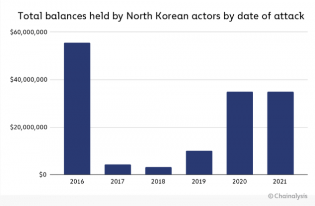 북한이 보유한 암호화폐 중 약 3,500만달러는 20202021년 입수한 것으로 5,500만달러 이상은 2016년 실행된 공격에 의한 것이다.이들 정보는 북한 해커가 훔친 가상화폐를 바로 세탁한다고 볼 수 없음을 시사한다.