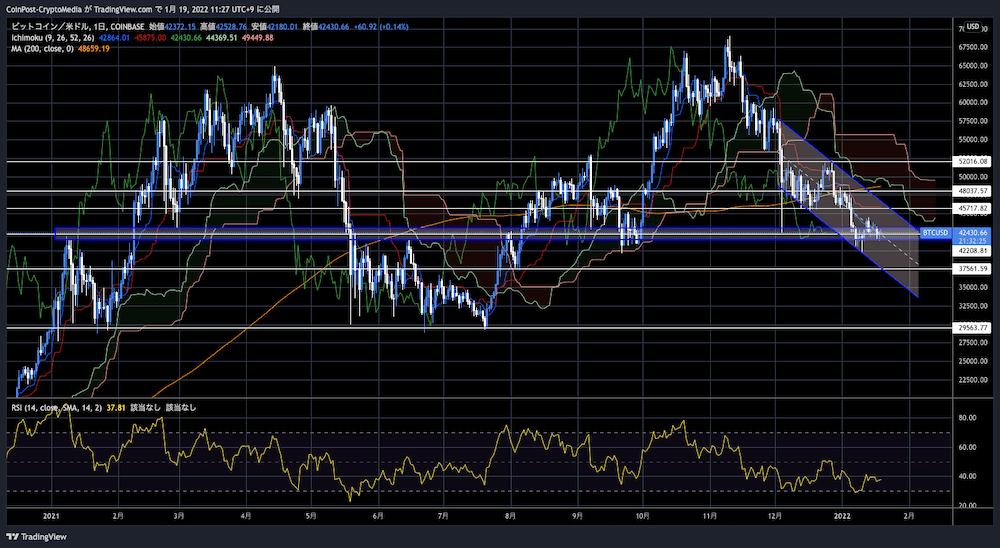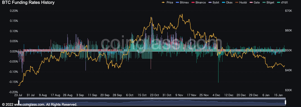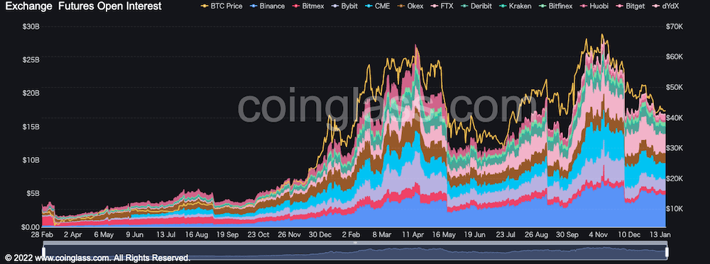21년 12 월상순의 폭락 후에 다시 쌓아 올린 선물 OI(OI:Open Interest, 포지션)는, 12월 하순을 경계로 해 리스크 오프가 강해지면 점차 박리. 1월 19일 현재는 다시 지난해 2월, 8월과 비슷하지만 Binance BTC Futures를 필두로 여전히 높은 수준에 있는가.