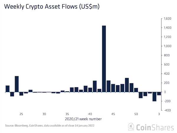 덧붙여 CoinShares의 주차 리포트(Volume 62: Digital Asset Fund Flows Weekly Report)에 의하면, 암호 자산(가상화폐) 펀드의 기관투자가의 플로우에서 지난 주에도 유출초과가 되어, 유출액은 과거 5주 동안에 5억달러를 넘었다.