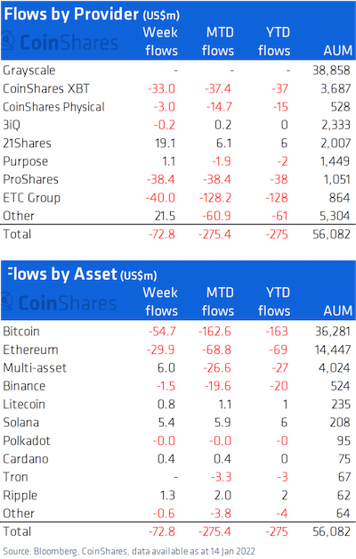 5억달러 중 비트코인(BTC)이 3억1700만달러, 이더리움(ETH)이 2억3,000만달러를 각각 차지했다.지난주 통계 데이터에서도 -7300만달러/주의 유출초과로 기관투자가의 디지털 자산으로의 노출 감소를 나타내고 있다.