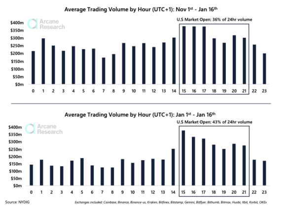 Arcane Research는, BTC 가격은 미국 시간(22:00~다음 10:00, 서머 타임 21:00~다음 9:00) 중의 상승률이 높다고 지적.전체 비트코인 거래량의 무려 43%가 미국 주식시장이 열려 있는 시간대에 집중 기록돼 있으며 암호화폐 시장에서도 미국인 트레이더 비율이 높아지고 있음을 언급했다.