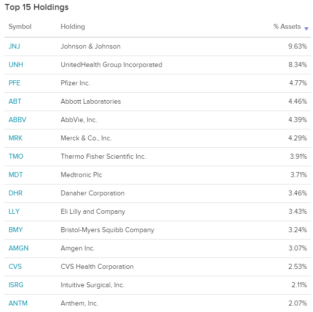 XLV는 거의 모든 측정에서 미국 의료 부문을 지배합니다. 이 기금은 제약, 의료 장비 및 용품, 의료 서비스 제공자 및 서비스, 생명 공학, 생명 과학 도구 및 서비스, 의료 기술 산업의 기업에 대한 노출을 제공합니다. XLV는 전략적 또는 전술적 위치에 널리 사용되기 때문에 세그먼트에서 가장 오래된 것입니다. XLV는 캡 가중치가 있고 S & P 500에서만 추적하기 때문에 메가 캡쪽으로 크게 기울어집니다. 주요 건강 관리 이름에 집중적으로 노출하려면 XLV를 이길 수 없습니다.