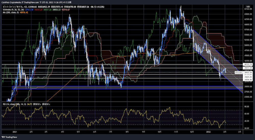 한때 39,300달러까지 속신장해도, 레지스탕스 라인(상가 저항선)과 트랜드 라인의 틈새 부근에서 상한가를 무겁게 하고 있던 것에 악재가 겹쳤다. 금융시장 전체가 하락 트렌드의 와중에 부정적 요인에 과잉 반응하기 쉬운 상황이다.