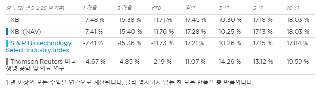 따라서 XBI가 좀 더, 바이오테크놀러지에 집중된 ETF라고 볼 수 있습니다.