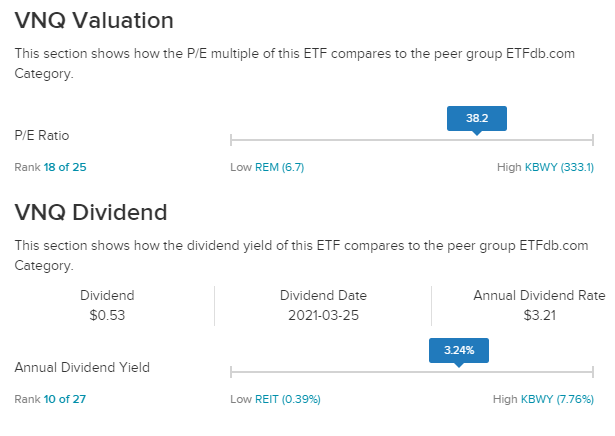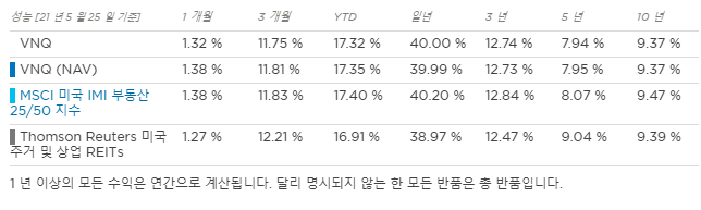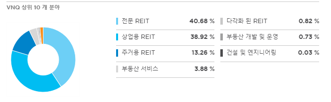 VNQ는 미국 부동산 소유권 및 운영과 관련된 회사의 시가 총액 가중치 지수를 추적합니다.