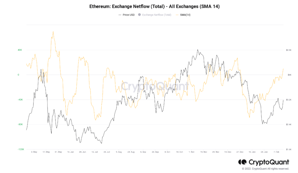 데이터 분석 기업 CryptoQuant의 maartunn씨는, 이더리움(ETH)의 Exchange Netflow(14 DSMA)가 급상승하고 있는 것을 지적했다.