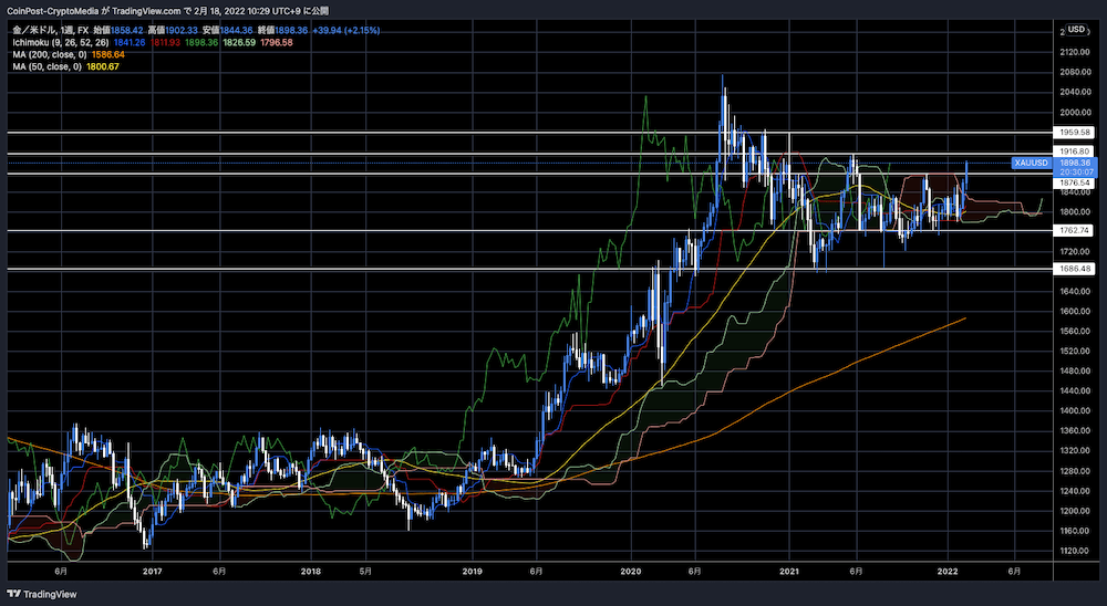지정학 리스크로 볼라틸리티(가격변동성) 높아지는 금융시장에서는 안전자산으로 여겨지는 금(골드) 가격이 자금 도피처로 상승하고 있다. 2022년 3월부터 정책금리 인상이 유력시되는 영향도 있어 금값은 8개월만의 최고치인 1,900달러대에 이르렀다.