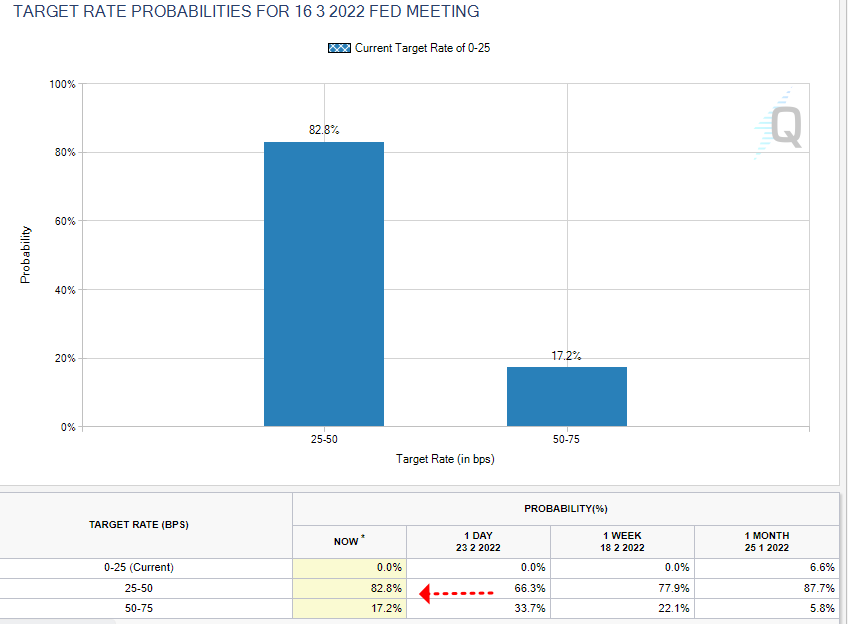 이로 인하여, 국채 금리는 낮아졌으며, 전쟁 이슈로 인해 3월 금리 인상에 대한 연준의 입장도 모호해졌죠.