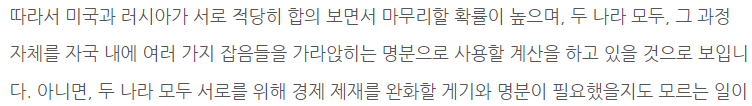 많은 사람들이 전쟁에 공포에 떨고 있지만, 이전에 썼던 글에서도 언급했던 것처럼, 미국과 러시아가 서로 적당히 합의 보면서 마무리할 확률이 높습니다.