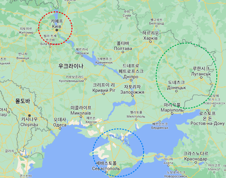 앞서, 2월 13일에 우크라이나 문제에 대해 글을 쓸 때에는 러시아가 돈바스 지역만(아래 초록색 원)을 병합하는 선에서 마무리될 것이라고 예측했는데요. 여기서 한발 더 나아간 푸틴은 한국 시간으로 22년 2월 24일 우크라이나의 수도 키예프를 향해 직접적인 미사일 공격을 하였습니다.