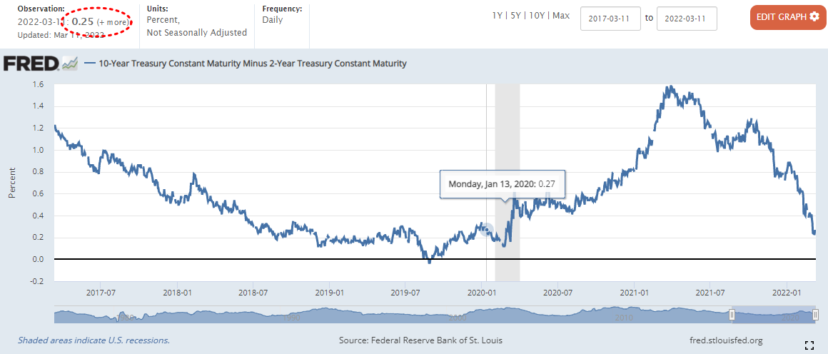 2022.03.11 - [주식 정보/미국) 시황 체크] - 미국 시황) 미국 10년물 국채 금리 급등, 장단기 금리차 변화는? _22년3월10일