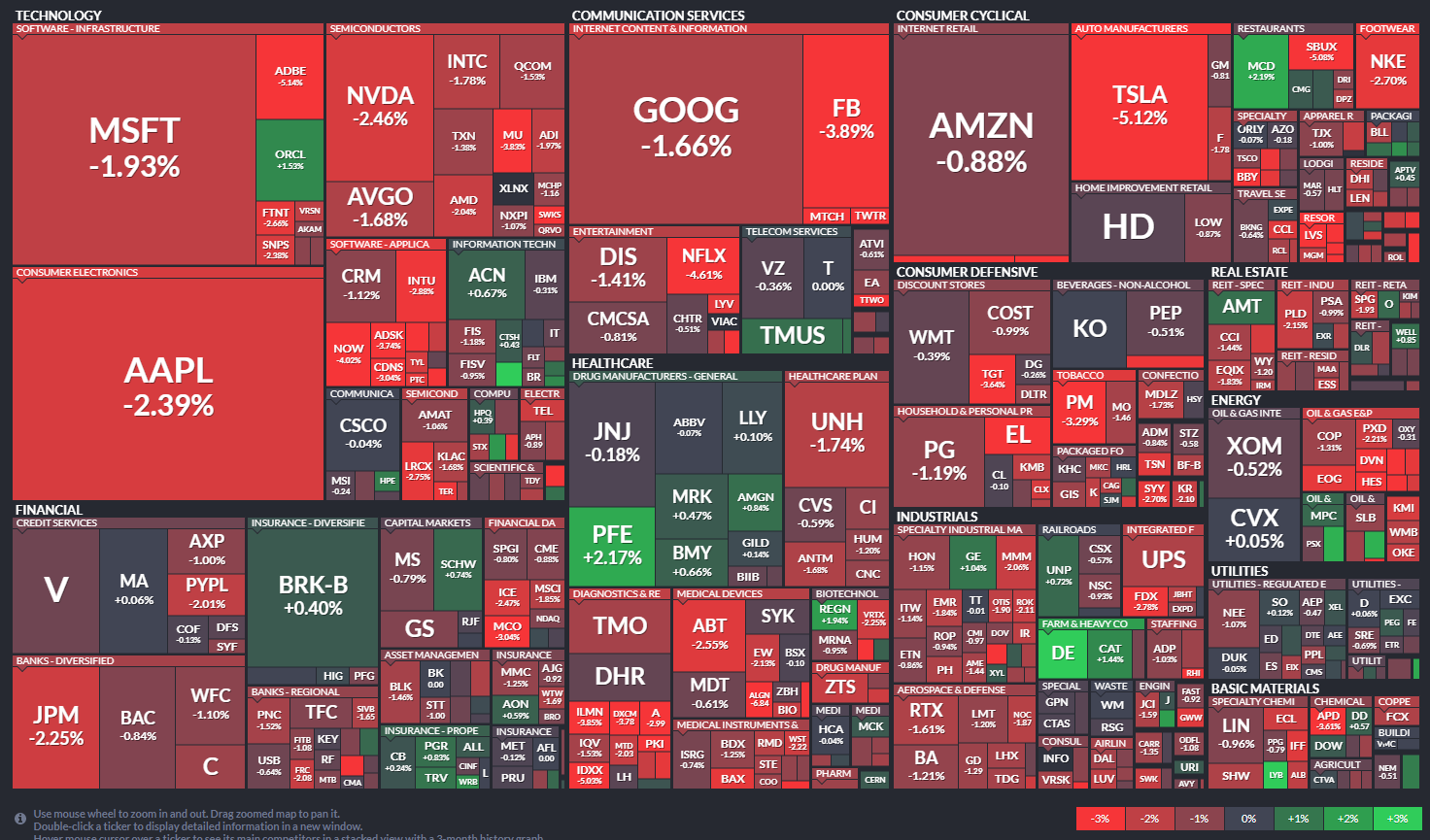 다우 -0.69% / S&P500 -1.30% / 나스닥 -2.18% / 러셀 2000 -1.47%