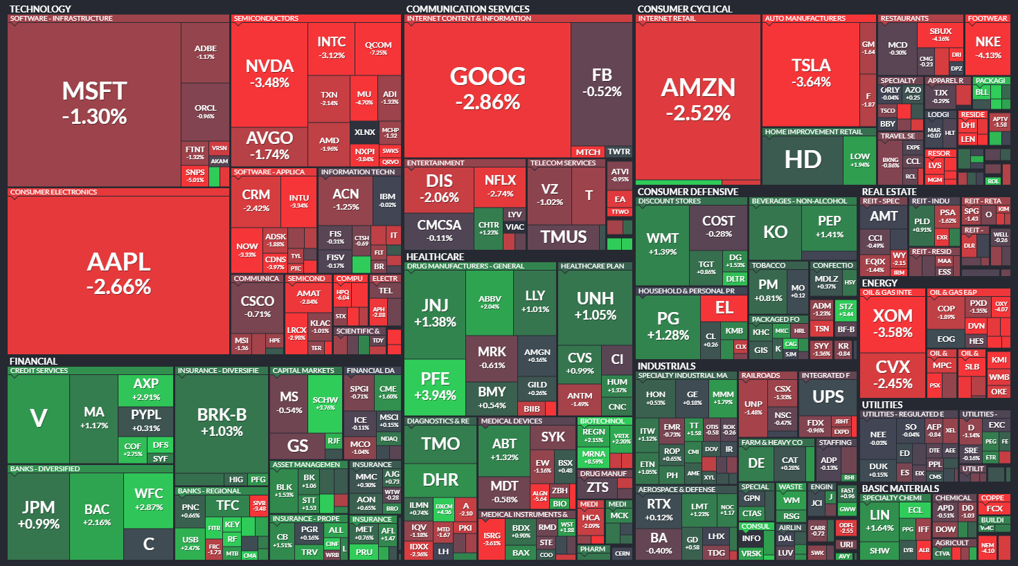 다우 +0.00% / S&P500 -0.74% / 나스닥 -2.04% / 러셀 2000 -1.89%