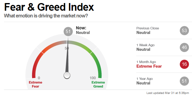 53에서 2포인트 하락한 51포인트로 마감 (지수 등락에 비해 센티멘탈 강함 1분기 실적 시즌 염두)