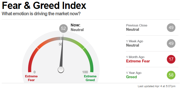 49에서 3포인트 상승한 52포인트로 마감 (지수 등락에 비해 센티멘탈 강함 1분기 실적 시즌 염두)
