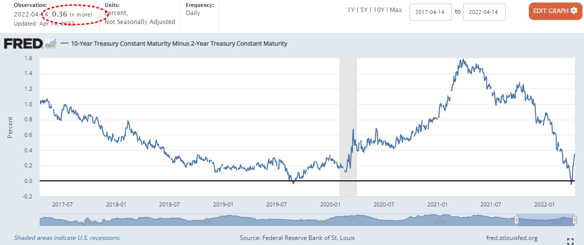 0.33%에서 0.03%상승한 0.36% (22년 4월 1일자로 장단기 금리차 역전)