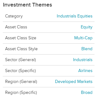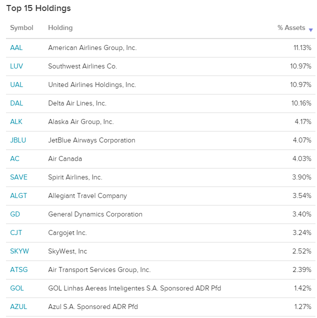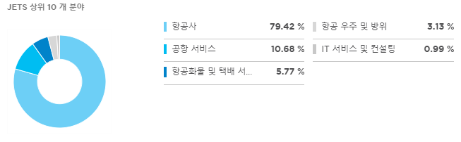 JETS는 미국 및 미국 외 항공사 모두에 투자합니다. 이 집중된 포트폴리오는 국내 여객 항공사에 가중치를 둡니다.