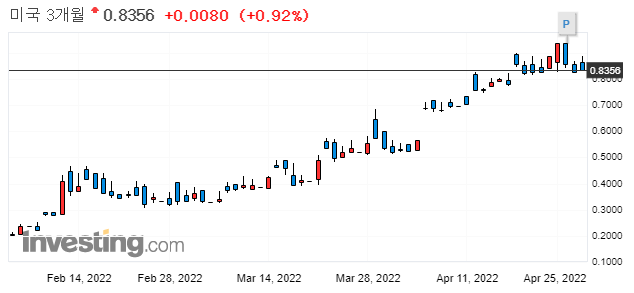 0.18%에서 0.05%상승한 0.23%마감 (22년 4월 1일자로 장단기 금리차 역전)