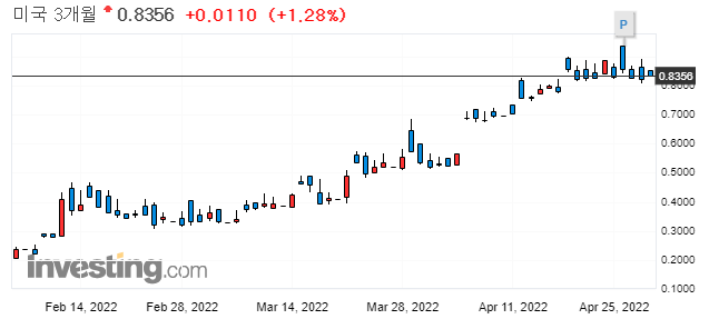 0.23%에서 0.01%하락한 0.22%마감 (22년 4월 1일자로 장단기 금리차 역전)